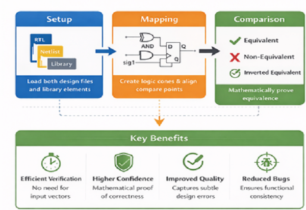 In VLSI design, equivalence checking is a key part of the broader discipline known as formal verification. Unlike functional verification, which relies on exhaustive simulation with test vectors, equivalence checking uses mathematical modelling to prove that two versions of a design behave identically under all circumstances.