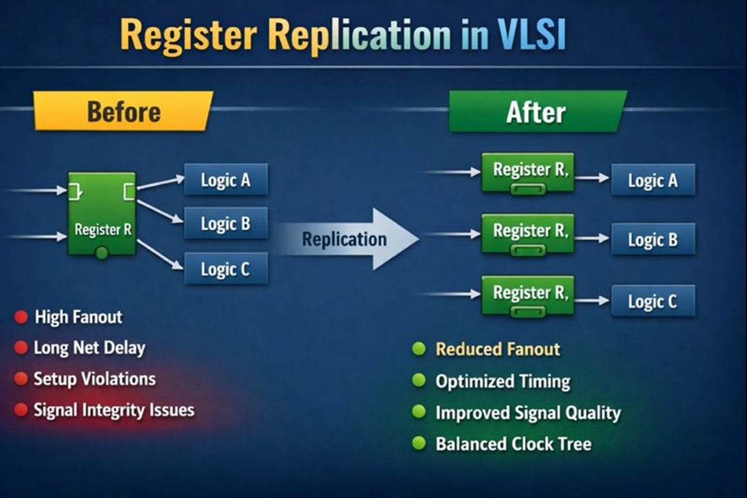 Register Replication is an optimization technique used in VLSI design where a single register driving many loads (high fanout) is duplicated into multiple identical registers. Each replicated register drives a smaller set of loads.